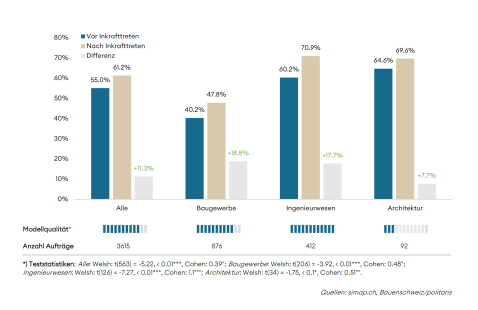 Vor der Revision betrug der Anteil qualitativer Zuschlagskriterien für alle Bundesvergaben im Mittel 55%. Seither hat der Anteil um 11,3% auf 61,2% zugenommen. Das Ergebnis erzielt 10 von 12 Punkten bei der Modellqualität. Der Unterschied ist zu 99 Prozent gesichert, aber von geringer Stärke.