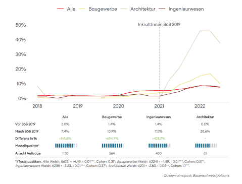 Mit dem neuen Modell wird sichtbar, dass die Bedeutung der Nachhaltigkeit ab Inkrafttreten des BöB für Teile der Bauwirtschaft markant zugenommen hat. Waren vor der Revision in Architekturaufträgen noch keine dieser Kriterien enthalten, ist der Anteil der Aufträge mit Nachhaltigkeitskriterien seither sprunghaft auf 28,6% angestiegen. Beim Baugewerbe von 1,4% auf 10,9%. Hingegen unterschied sich die Entwicklung bei Ingenieurleistungen kaum von derjenigen bei allen Aufträgen. Zwischen Sommer und Herbst 2022 folgte ein starker Rückgang. Die Ergebnisse sind zu mindestens 95% verlässlich.